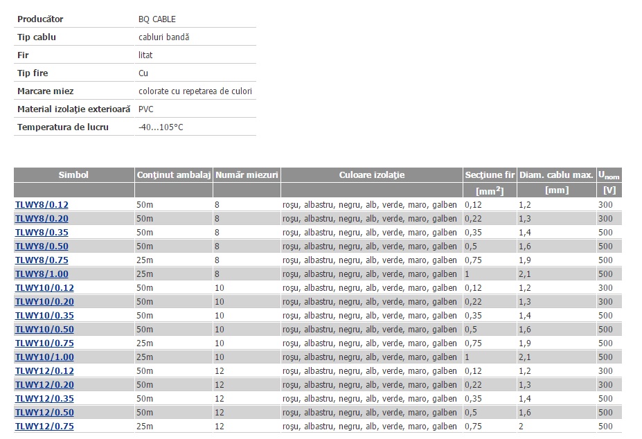 Cablu banda, 10 fire, 0.75mm2, Cu, 500V, TLWY10/0.75