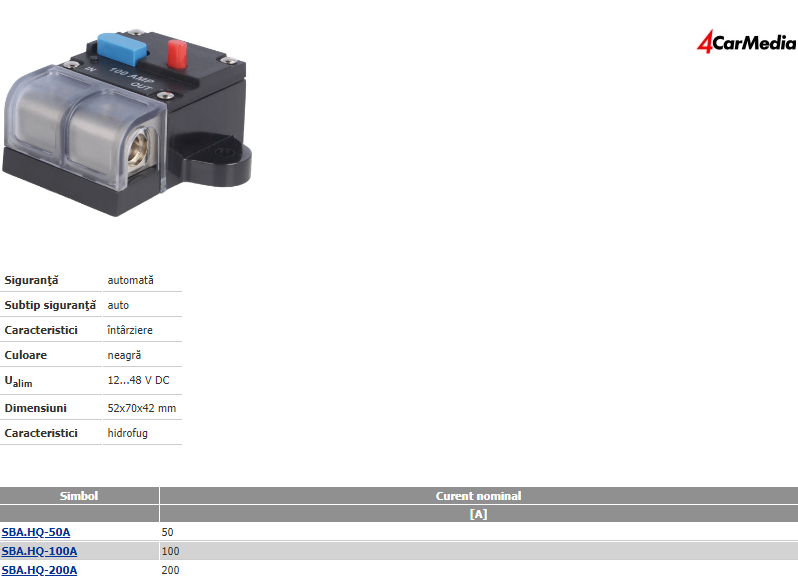 Siguranta automata, auto, 100A, neagra, 12-48VDC, 52x70x42mm, SBA.HQ-100A, 4CARMEDIA