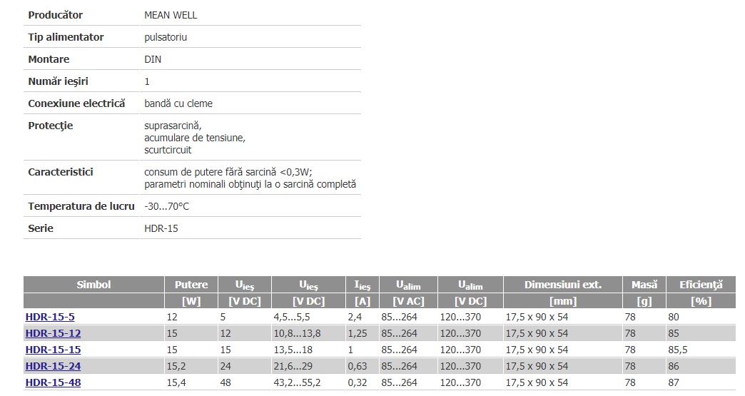 Sursa 15VDC, 4A, SINA, AC-DC, HDR-60-15, MEAN WELL