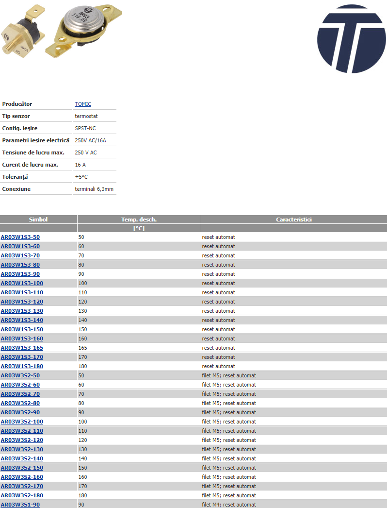 Termostat bimetalic, 120C, NC, 16A, 250VAC, AR03W3S2-120, TOMIC